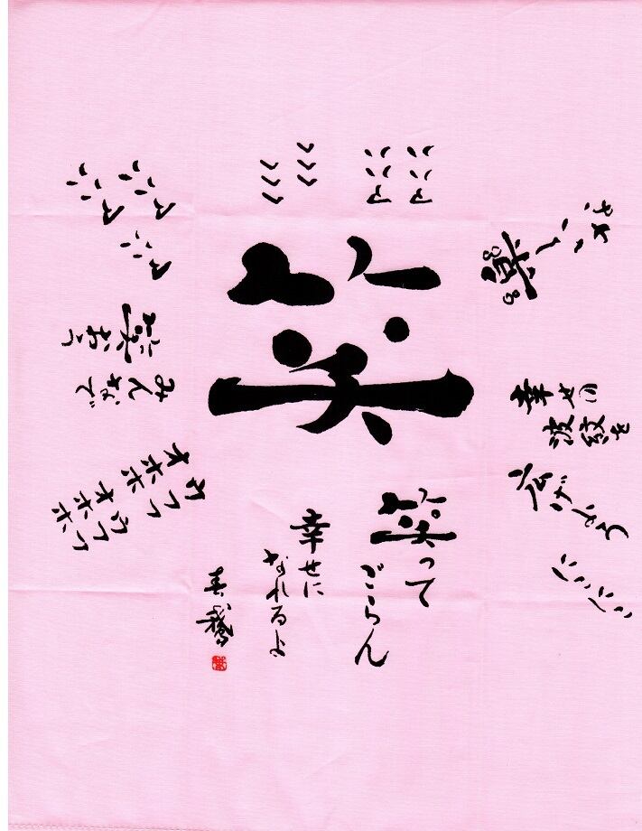 笑う! いつでも笑えるように ハンカチをつくってみました。 ピンク・グリーン 40センチ(正方形) 汗ふきに、プレゼントにいかがでしょうか。 お部屋の飾りにもいいですね!